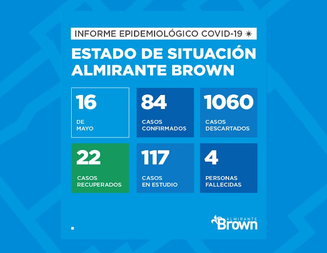 La Secretaría de Salud del Municipio de Almirante Brown informó que al sábado 16 de mayo de 2020 se registraban 84 casos positivos de Coronavirus notificados por las autoridades sanitarias nacionales. Mientras tanto, 1060 test realizados en el distrito dieron negativos y 117 casos se encuentran en estudio.